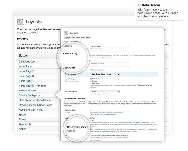 Unlimited Custom Headers Create custom headers for your layouts and attach any content, sidebars, slide show, background image, colors and more. Assign a header to a layout or specify a custom header for any page or post as needed.
