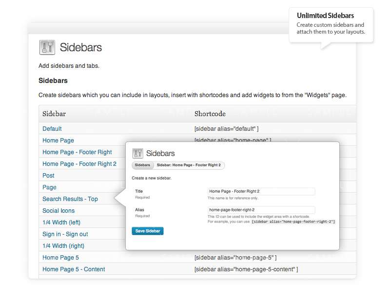 Unlimited Sidebars Create custom sidebars using the sidebar generator. Assign sidebars to layouts or insert them directly into content using the sidebar shortcode.